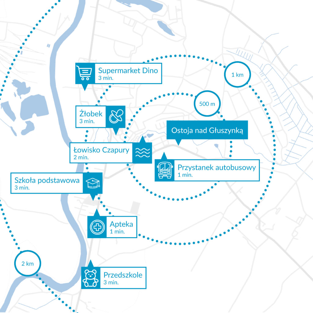 Ostoja nad Głuszynką zapewni Ci również wygodny dostęp do wszystkich niezbędnych na co dzień lokalizacji. Blisko sklepy spożywcze, popularne markety (Żabka, Dino, Lidl, Netto), przystanek autobusowy, przychodnia, apteka, paczkomat i liczne punkty usługowe. Samochodem w kilka minut dotrzesz także do żłobka, przedszkola oraz szkoły podstawowej. Zwiń ∧